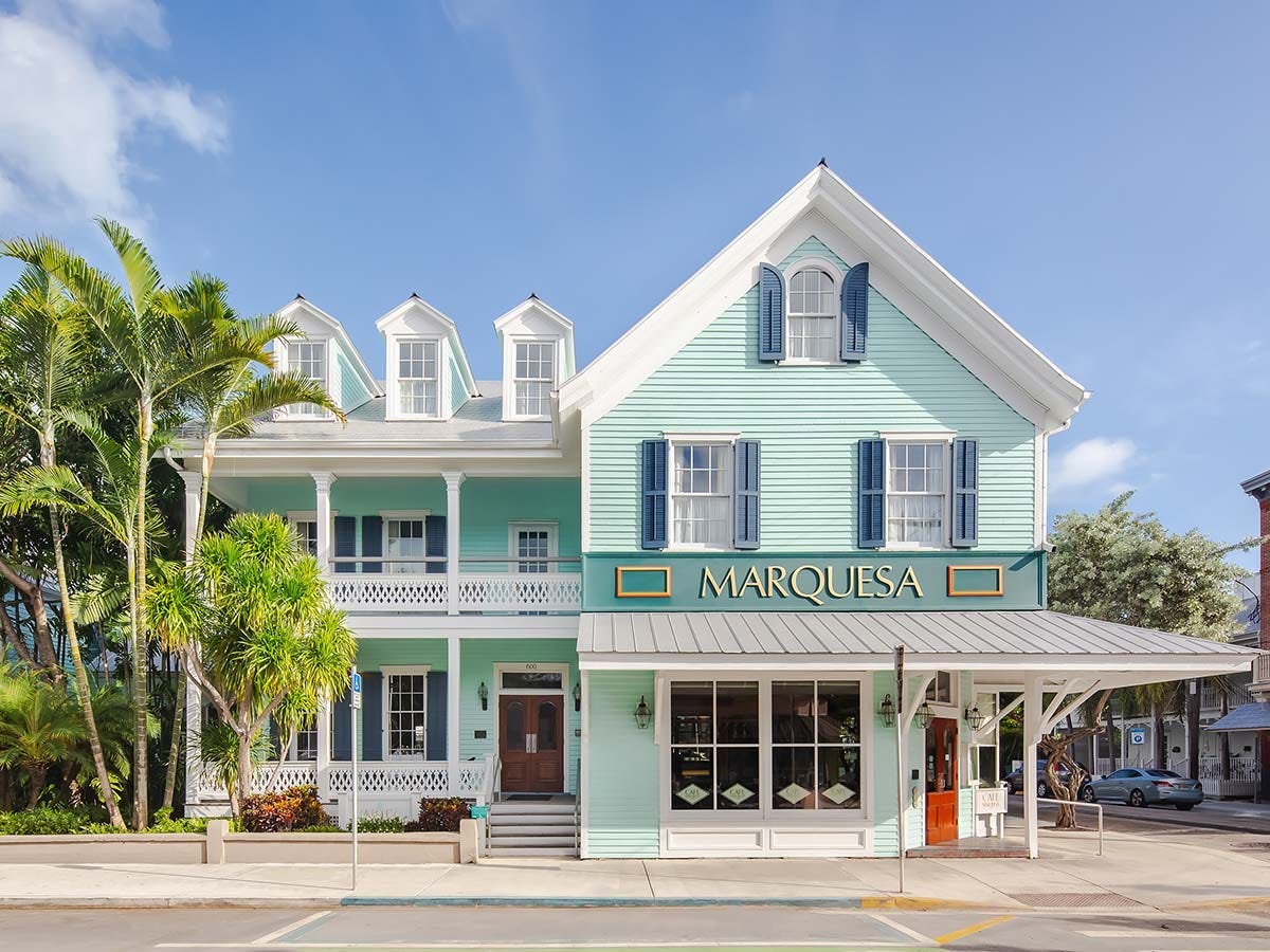 On the corner of Fleming and Simonton Streets in the heart of Old Town, Marquesa epitomizes Key West architecture — tin roofs, seafoam clapboard siding, and a wrap-around white porch. Beyond the façade, a secluded courtyard under a tangle of palm fronds is home to three swimming pools. There are 44 rooms inside a complex of restored, Victorian-style cottages dating back to the 1880s. While no two rooms are the same, they’re all spacious, and all decorated in a tropical-classical manner, with wood furniture sourced from around the globe. Plenty have a separate seating area and patio or balcony, making for an idyllic setting for wine before dinner.