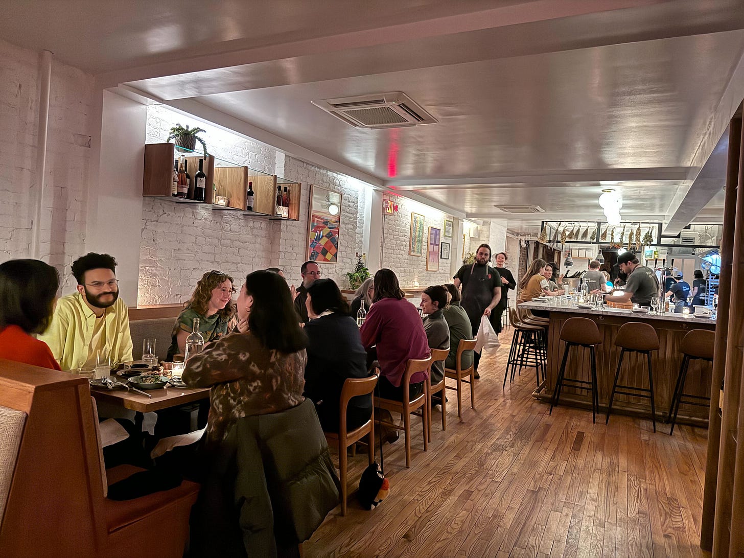Tolo, new in Dimes Square, is a paragon of the form and a welcome place to catch up with an old friend, as I did last week. The marquee of the space’s longtime inhabitant , Ming’s Caffe, still tops the storefront, and the decor is a touch underbaked, a common motif among the city’s wine bars. A metal door opens into a low-lit room perfect for a date. On this night, the room started quiet and mostly empty, but by 7:30p, it was packed and loud.