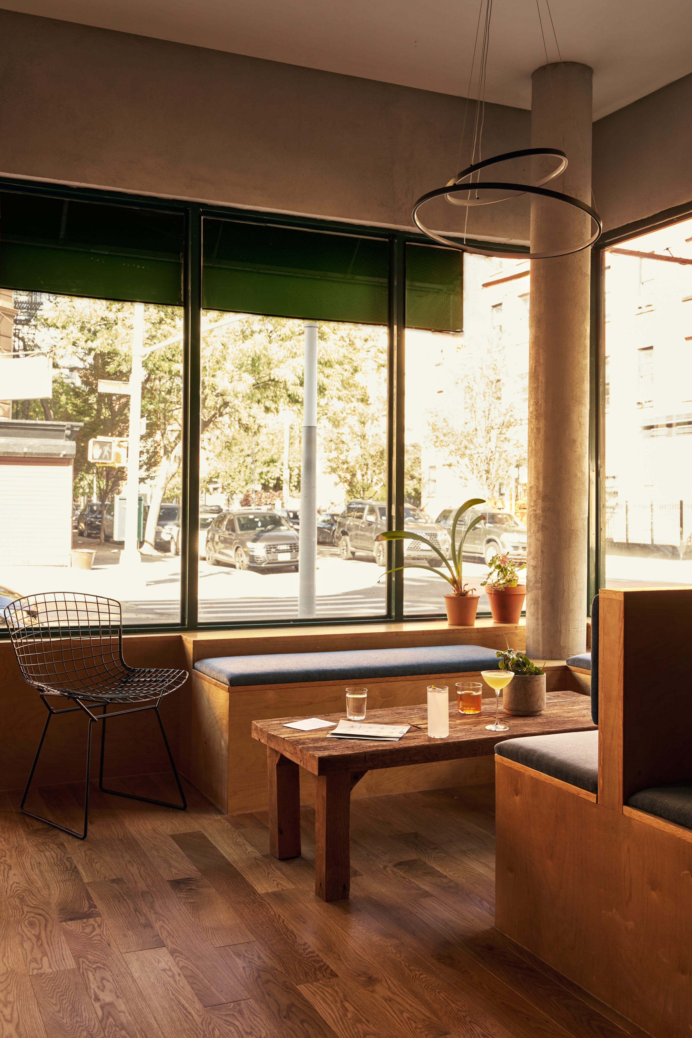 The austerity is offset by the room’s communal design. Simple wooden banquettes with gray cushions line the front windows, positioned to create little drinking nooks; a spacious perched table in the back is equipped with eight stools. But the best seats in the house are at the lone oversized booth tucked in the middle.