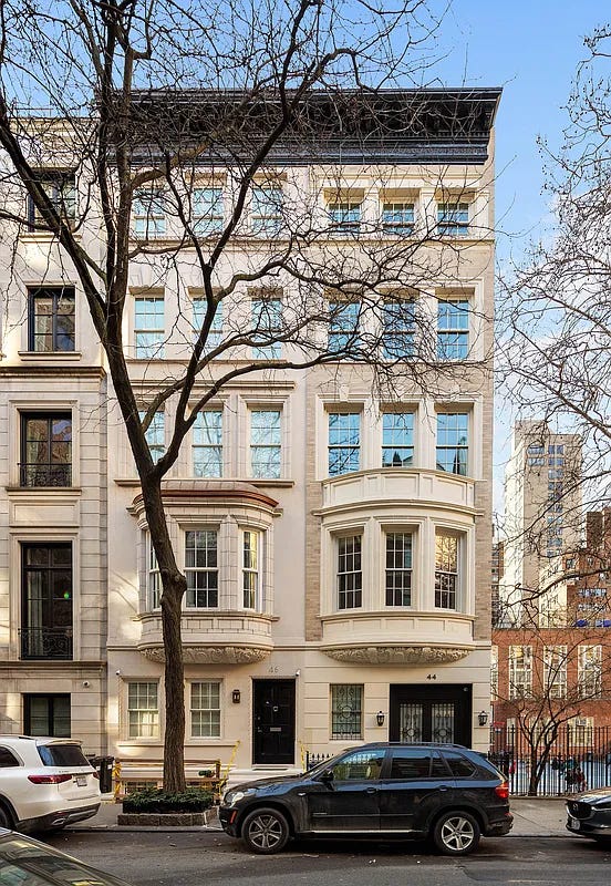→ 44 E 82nd St (Upper East Side, above with 46) • 4BR/5.2BA, 6310 SF townhouse • Ask: $13.8M • between Madison and Park and ‘newly reimagined’ by Diego Delgado-Elias • Days on market: 3 • Monthly tax: $6715 • Agents: Carrie Chiang & Andres Perea-Garzon, Corcoran.