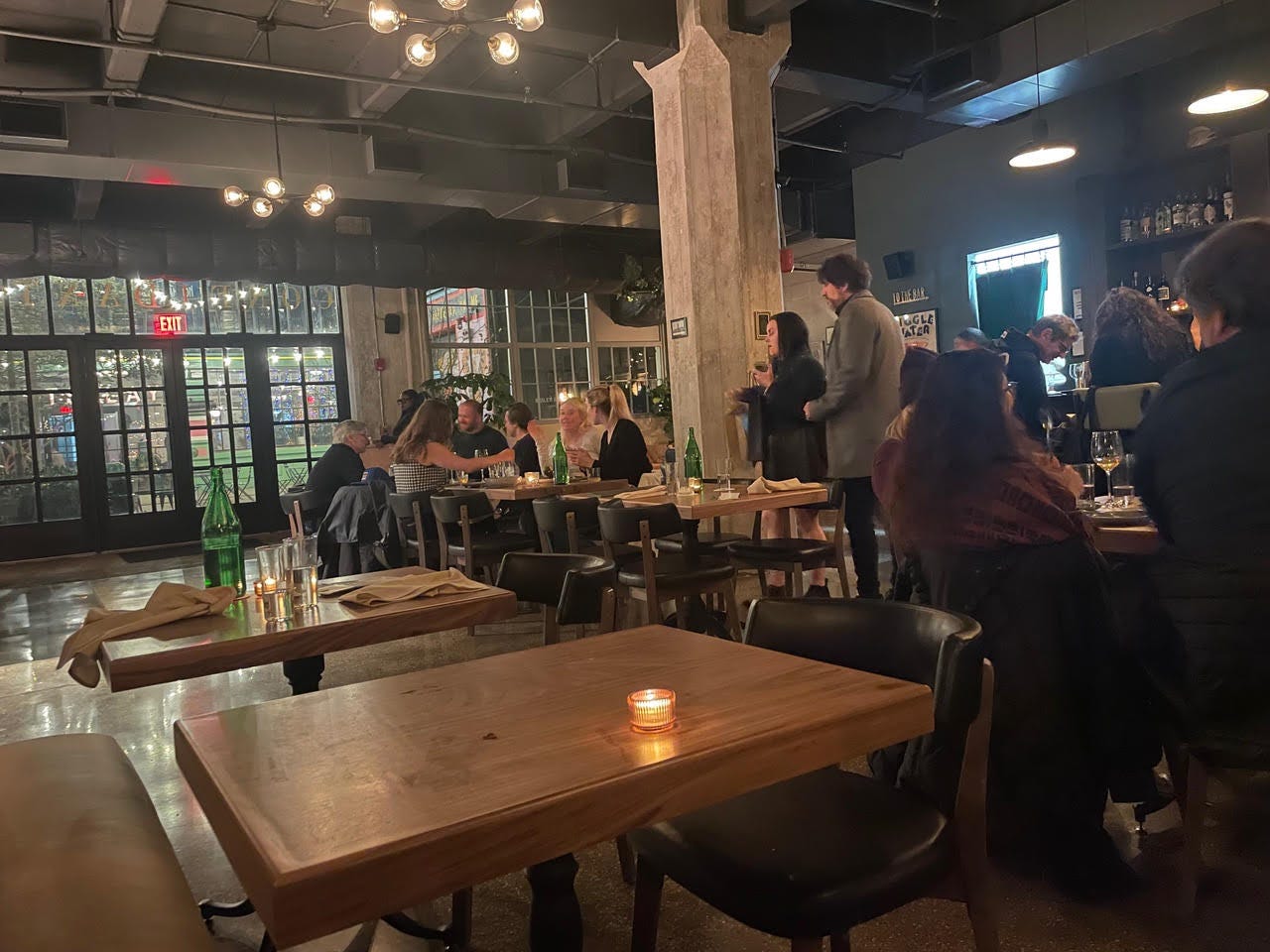 The Vibe: A vaguely industrial, large canvas equally appropriate for business dinners, dates, and shopping drama cool downs. The big space allows for a proper waiting area, replete with sinky sofas and chairs. Much of the rest of the space is dedicated to walking around room, which means the tables, especially two-tops, are tightly packed. Some of the design flourishes work, like the walnut tables handmade by a local artist. Other touches, like a pretty enough but too-familiar oversized liquor brand print, are a reminder of the psuedo-mall surroundings.