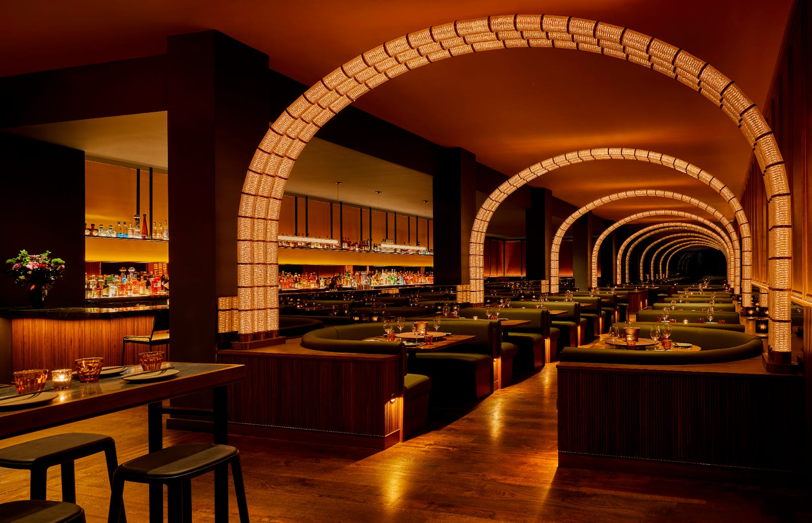 The Vibe: Like Cote, Coqodaq has a spirit so lively it could be mistaken for a nightclub. The entrance is striking: a wall outfitted with three black soapstone handwash stations. Inside, illuminated glass, bronze arches, and a rear infinity mirror make the room feel magnitudes larger than it is. Flanking an L-shaped bar is the majority of the seating, green leather horseshoe booths for four (which they’ll reserve for two or three in the first and last seatings). There’s also a space up front with high-top, communal dining tables for walk-ins.