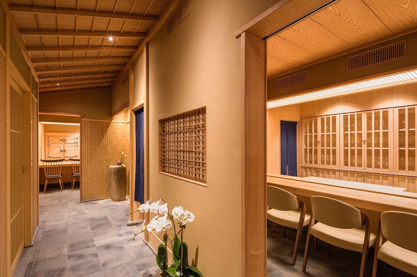 The Experience: Two chefs, two counters. Nozomu Abe (“Noz”) typically helms the eight-seat Hinoki Counter (above, left), which is enveloped in an intimate room decorated in a dozen varieties of cedar wood. At the six-seat Ash Counter (above, right), second-in-command Yudai Shibata is in charge. The omakase is the same at each counter, and costs $550 per.