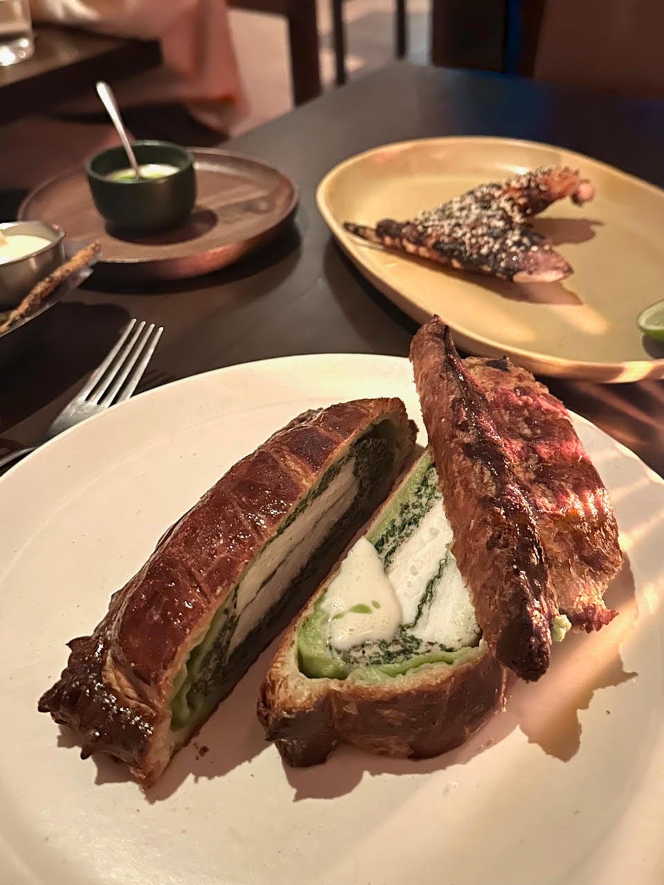→ TIDE IS HIGH: It’s been five months since the loss of chef James Kent, one of the industry’s brightest stars. His final project, Time and Tide, opened late October with his protégée (and Top Chef winner) Danny Garcia helming the kitchen. The Park Avenue space manages to instill a sense of intimacy despite its enormity. The menu is set like a steakhouse, but with only seafood. It’s all à la carte, down to sauce selection. The halibut pithivier (above), with spinach and mushroom duxelles wrapped in a delicate puff pastry, is quickly becoming a signature dish. Plenty big enough for two, pair this with vin jaune cream and the highly addictive nori fries. The wine list is superb — no surprise there, as Kent Hospitality Group’s wine director Kristen Goceljak is often first to feature trendy cult-like bottles on her lists. The excellent cocktails from bar director Harrison Ginsberg are ocean-themed. Reserve.