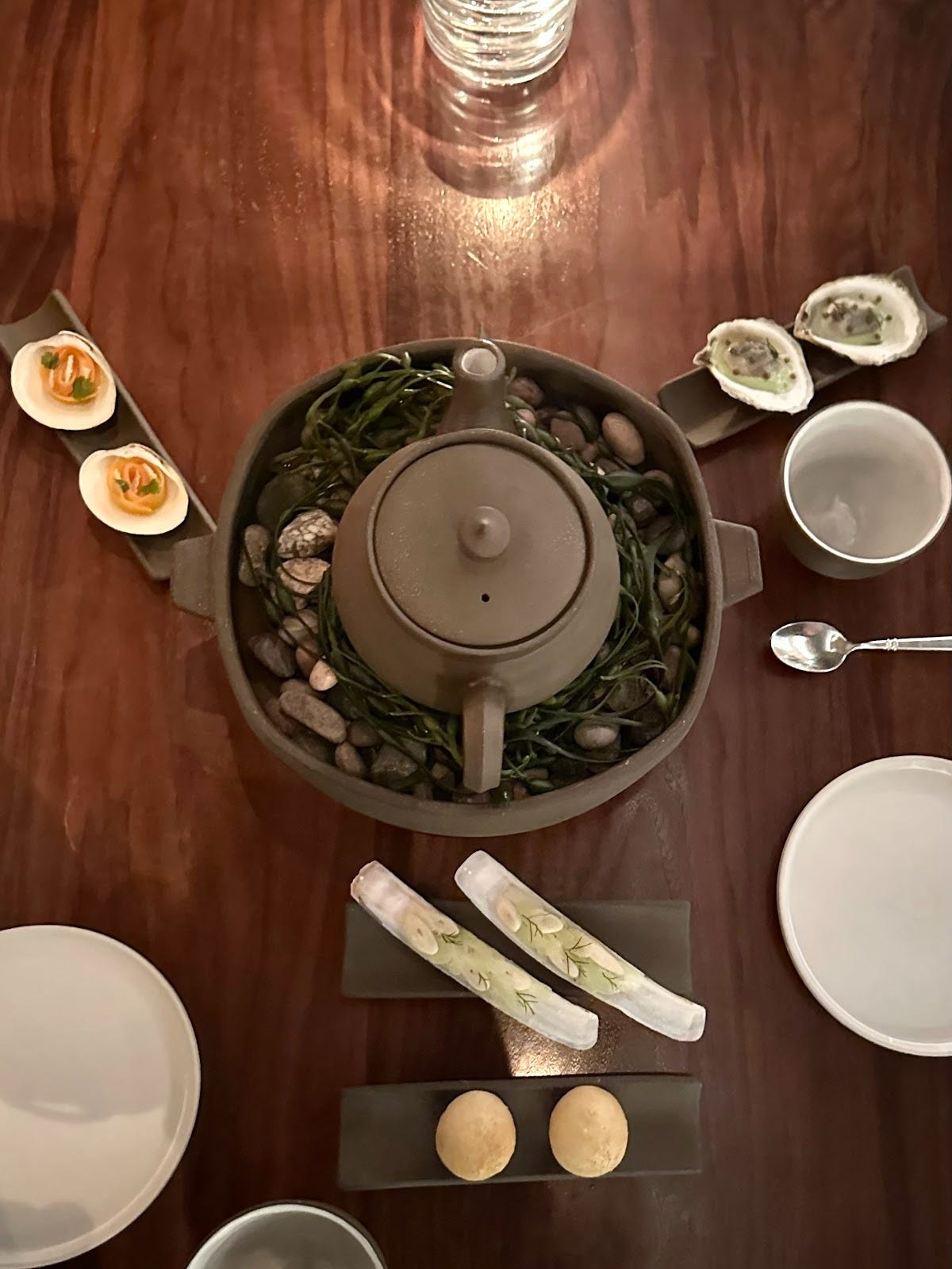 One of the opening highlights is the communal clambake (introduced in 2011, above), inspired by a trip to Tokyo and shabu-shabu. It centers on a rich, decadent clam velouté, accompanied by oysters and caviar, razor clams, littlenecks, and warm Parker House rolls. Another standout is the gently poached Montauk tilefish, beautifully presented with vibrant citrus, edamame, and a silky beurre monté sauce. The fish is impeccably cooked, of course — masterful seafood execution that hasn’t appeared in EMP’s kitchen for nearly seven years.