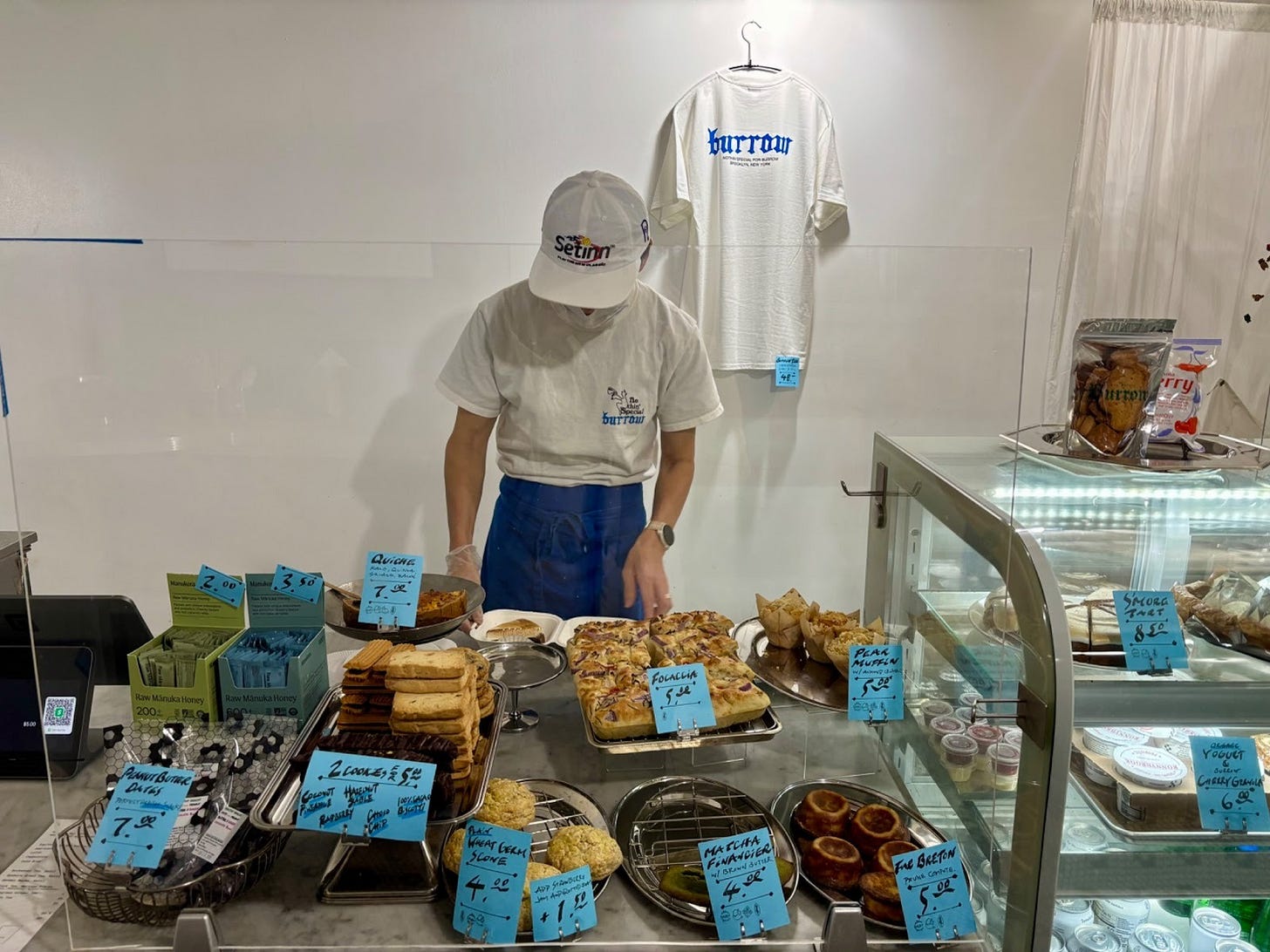 It’s time for FOUND readers to know about Dumbo’s splinter of a Japanese-French-American bakery, Burrow, open just a handful of hours a day, four days a week, through the lobby of an unmarked Jay Street building. It is — as far as gems hidden in plain sight go — one of the best running in NYC. The bakery, outfitted with just a counter and pastry cases, can barely fit four customers.