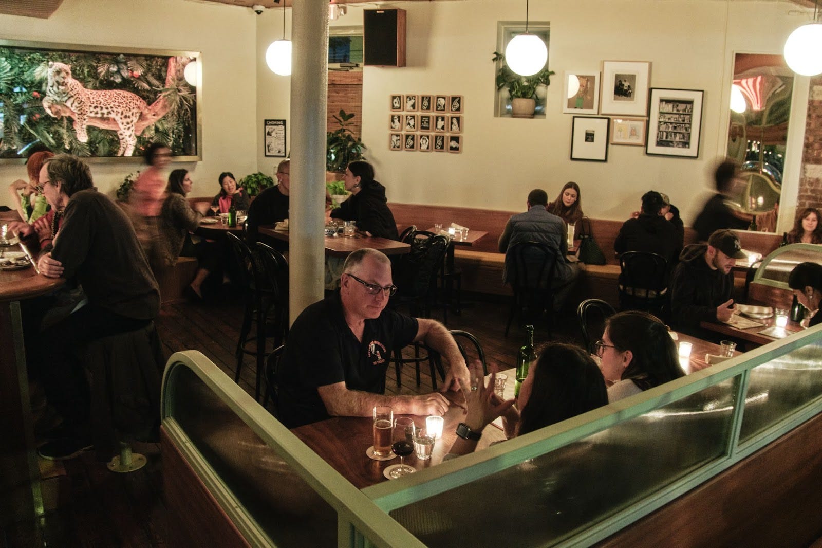 From our table, I had a clear view of an attractive taxidermied jaguar mounted on one of the art-filled walls. I drank Topo Chico in an elegant tumbler, inside which were stacked three very attractive clear ice cubes, and the kid had a blender drink — strawberry, coconut, pineapple, and lime juice, served in a tall glass full of (also gorgeous) ice nuggets. This attention to the aesthetics of ice is a tip-off that the place originally opened as a bar (they called it a “nighttime café”), with just enough good food to keep hungry drinkers upright. The other tell is the smart-but-not-too-smart cocktail list, featuring a bitter mai tai, and a rum and amaro-laced carajillo that, in a better world, would shut down the espresso martini industrial complex, forever.