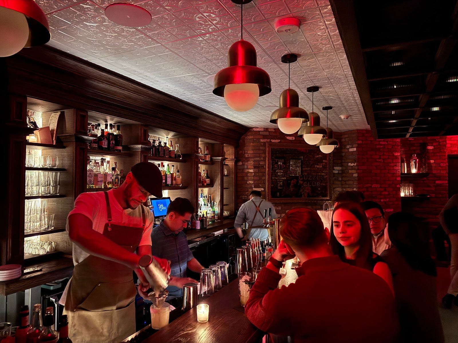 The contrast between the two spaces at month-old Greenwich Village bar concept Sip & Guzzle couldn’t be more stark. Upstairs, in the space that once housed Cornelia Street Cafe: a classic American saloon vibe, brick walls adorned with paintings and tchotchkes, a bar running the length of one room (above), the other room filled with tables for drinking and eating. This is, in the parlance of the house, Guzzle.