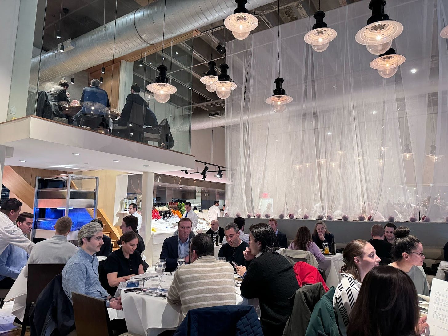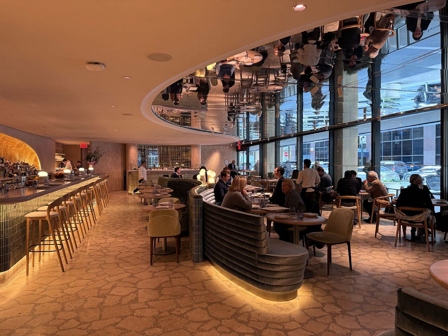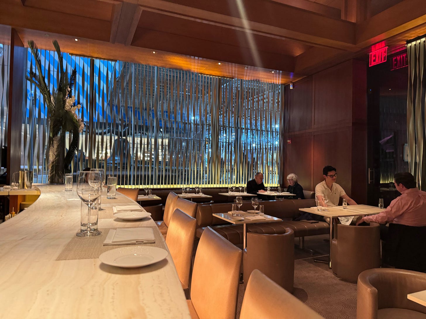 → To kick things off: Monday business lunch at POINT SEVEN (above), an ambitious new entry in these waters, tucked into the west side of Grand Central Station. It’s an appealing restaurant, decorated in warm wood and blue oceanic tones — but make sure you’re seated in the front room, which looks out onto the bustle of Vanderbilt Ave., and not the windowless (and vibeless) back room. The lunch rush filled half the place. Too bad, because chef/partner Franklin Becker was in the kitchen, an impressive showing during a Monday lunch service for a busy chef (see also, his newish The Press Club Grill in Herald Square). The food on our table — a luxe lobster roll, mussels, and a simply grilled red snapper — clicked for all in our group.