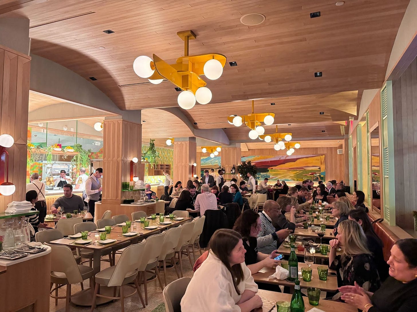 → ACADIA RISES: Another Midtown dining spot to have on the radar: Mediterranean brasserie Acadia (above), which opened last month on the northwest corner of 6th Ave. and 57th St. It’s from the team that enlivened Upper West Side dining with places like Nice Matin and Dagon. Here, chef Ari Bokovza is building on his work at Israeli-focused Dagon by expanding his menu’s horizons to Lebanon, Greece, Tunisia, and Morocco. Our table loved the six-part mezze platter (bless you, spicy feta and eggplant confit), and all the main courses, especially the crispy roasted lamb neck and marinated black cod served with citrus. Taking it all in a few tables away from us: NYPost restaurant critic Steve Cuozzo, who recently hailed the restaurant’s pastrami sandwich — an homage to the long-departed Wolf’s Deli — as the best in town. Yes, Acadia does lunch, too. –Lockhart Steele