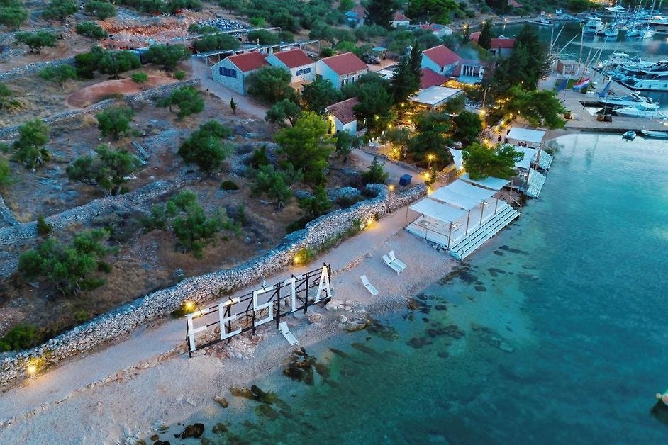 Festa has one restaurant and one bar — both outdoors. A market sells fresh-baked bread and fritules, which are small, sweet pastries, the Croatian version of doughnuts. There are glamping tents with bare essential and communal showers for rent if you tire of your shipmates.
