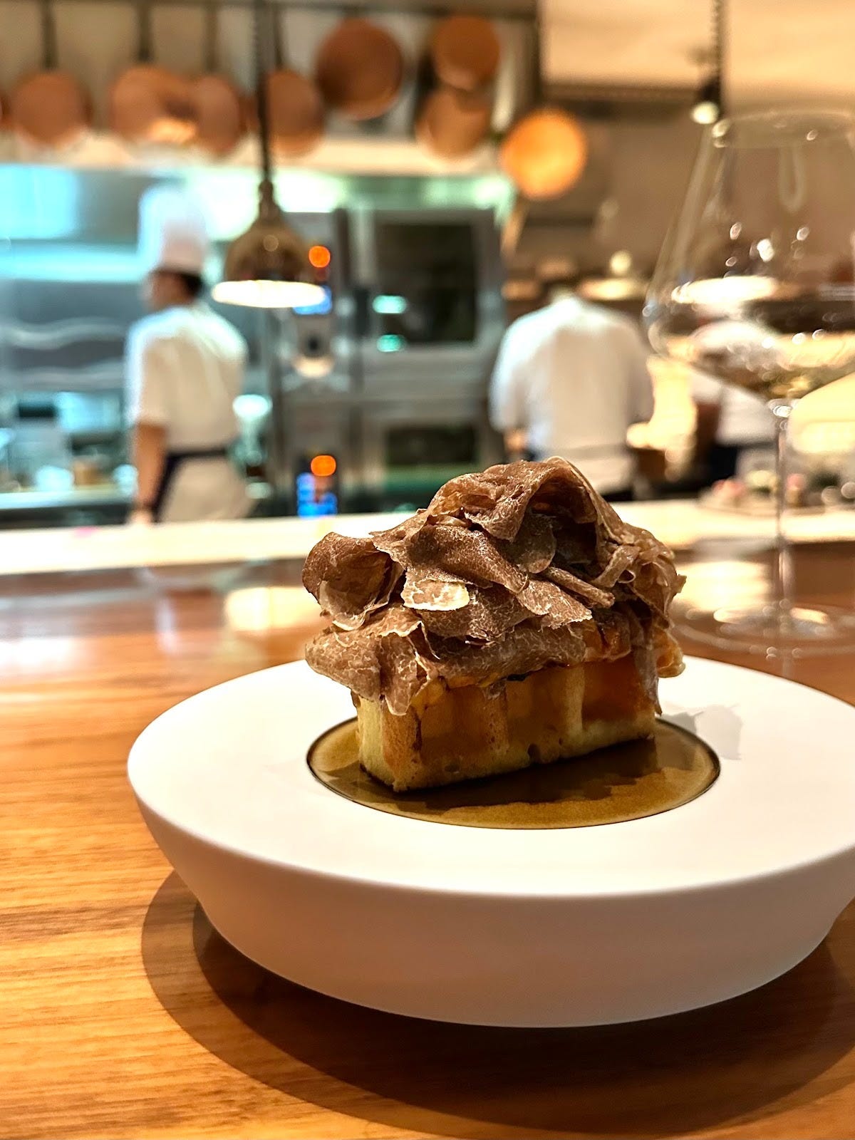 One of the most unforgettable white truffle dishes in the city has returned exclusively for the season at Chef’s Table at Brooklyn Fare: Hokkaido uni perched atop crispy Belgian waffle with caramelized butternut squash, crowned with a heaping portion of particularly pristine and aromatic Alba truffles (above). There’s one other can’t-miss truffle course at CTBF, one of my all-time favorite desserts: Japanese laminated brioche (also known as Fujisan) glazed with a Yamazaki 18-year whisky caramel, dusted in cardamom sugar, and served with a sidecar of coconut sorbet topped with yet more shaved white truffles from Alba. In a field of truffle standouts, that one’s particularly hard to beat. –Lee Pitofsky