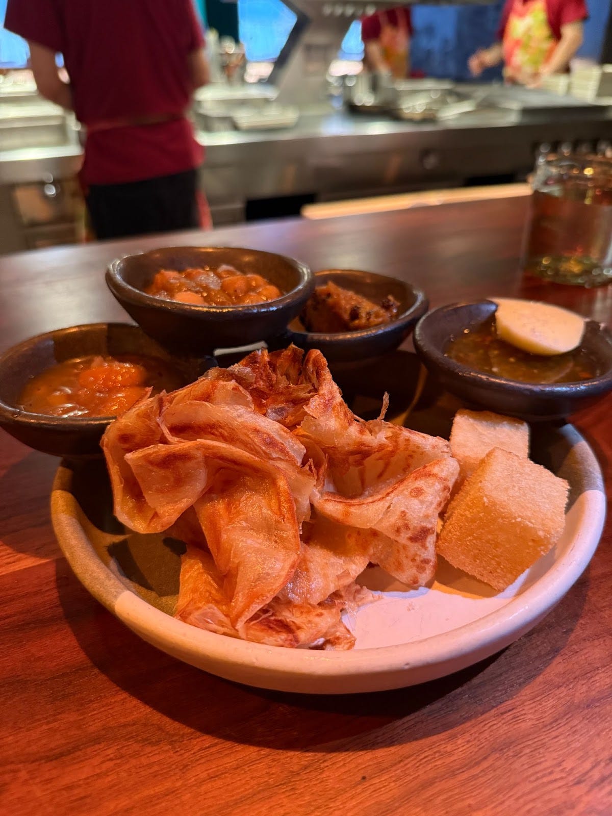 Everyone’s seated at the horseshoe counter framing an open kitchen in the middle of the room, a holdover from the space’s past life as Momofuku Ko. Interaction (and an occasional fist bump) with the chefs is inevitable, very much part of the show. Caribbean music blasts from speakers in the ceiling as the opening bread course — hot, buttery, griddled roti, served with four chutneys and relishes — sets a ridiculously high bar for what’s to come. The sauces are citrusy, acidic, sweet, and hot, sometimes all at once. The roti tastes as though it was genetically modified to perfection, and not just plain evidence of Carmichael’s flawless grasp of the fundamentals (which it is).