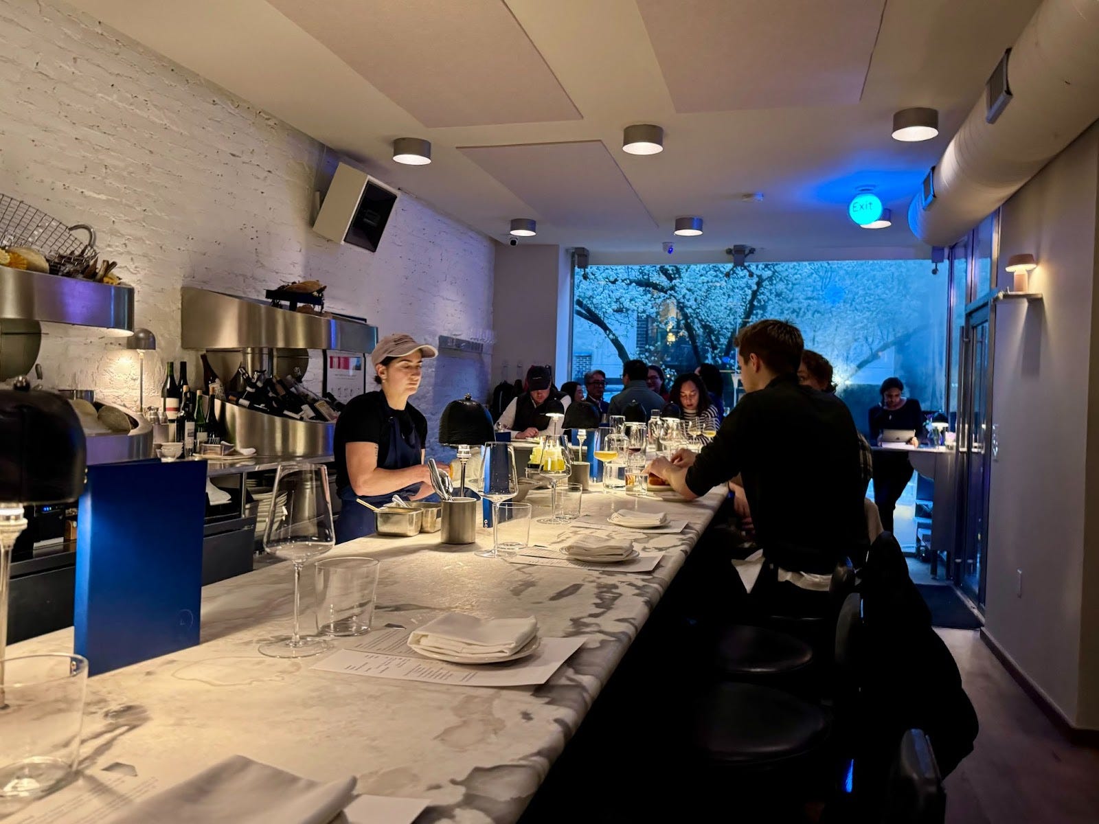 As at sister restaurant Claud downstairs, the Penny team took an unappealing space and upleveled it. The most genius design decision is the fact that there are no tables: A smooth marble-topped bar runs the entire length of the restaurant. Seated right in the middle of its length, we could watch the live lobsters in the ice basins across from us, and cast our eyes down the bar to the big windows looking out onto the flowering fruit trees on East 10th Street. It feels like Lisbon by way of the East Village. (To clinch this comparison, start as we did with the effervescent sherry cobbler cocktail.)