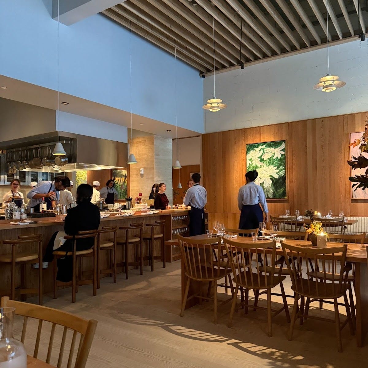 The tabletop details transcend the ordinary high-end restaurant experience, especially modern David Mellor silverware and sleek water glasses by Copenhagen-based Service Projects. Per the Cali-Scandi aesthetic, Louise Polsen lamps hang from the ceiling, and chairs are neatly under polished wooden tables, as if on display in a furniture showroom.