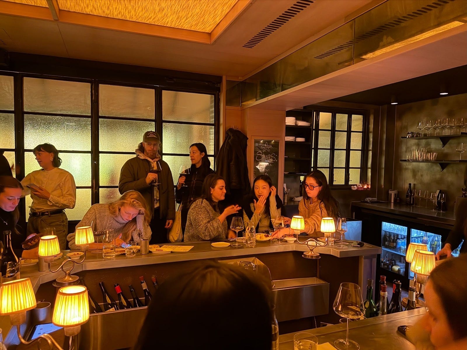 After ordering two glasses, we relaxed and took in the scene. The room is tiny (450 square feet), and the lighting is, appropriately, celestial. Soft light emanates from glowing panels on the ceiling and seeps in from the street through the frosted glass windows, further enhanced by the warm glow of sconces perched on the zinc bar. It’s a perfect winter bar, the kind of place you want to settle in for a few glasses over a deep conversation.