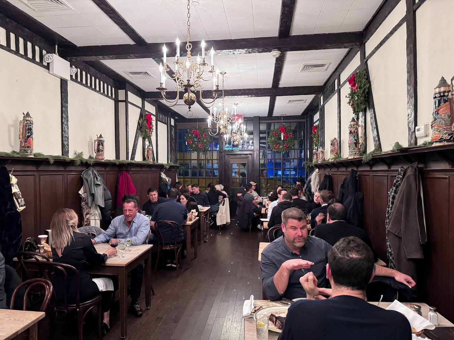 The next part of the ritual: finding out which dining room beckons. Broadway, to the right of the host stand, is where I had my first-ever Luger meal, so I have a soft spot for it, but one of my dining companions rates it last among the three options. Corner, to the left, is the largest and a fine choice, but Driggs (above), straight ahead, is the ancestral home of this holiday dinner and probably our favorite — and the one where, without asking, we were seated this year. (There’s also an upstairs, where we landed in 2021. Don’t let this happen to you.)