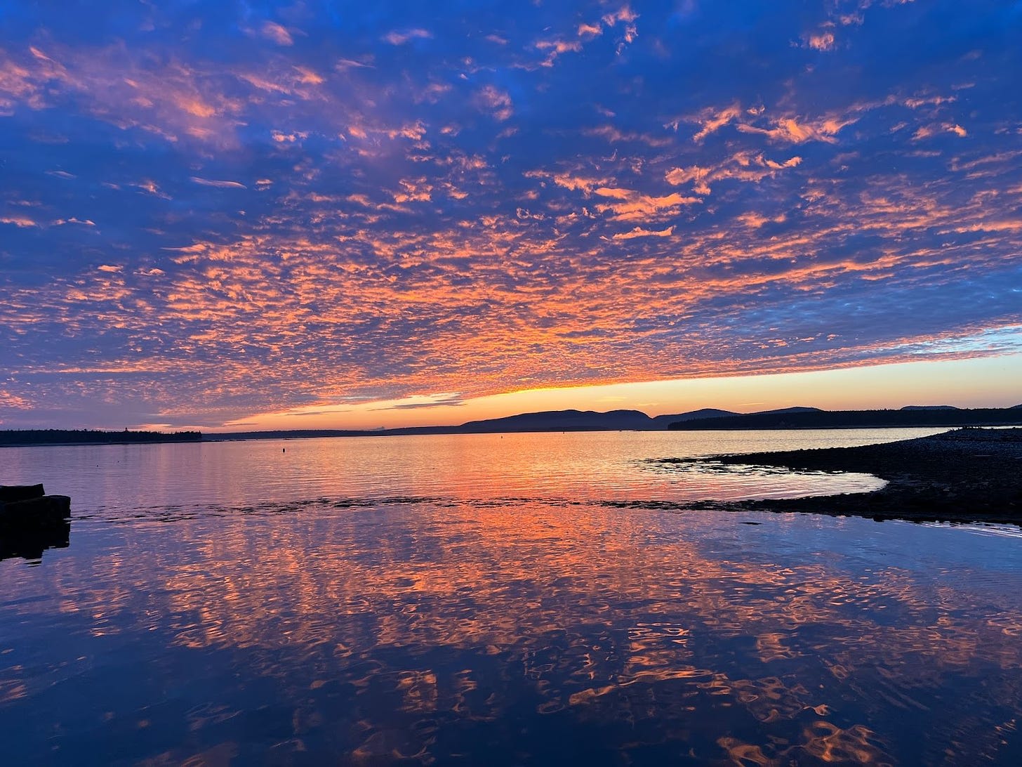 Back at the restaurant with some time to spare before our reservation, we sipped drinks on the dock, our elbows on the wooden rail pointed west toward the mountains of Acadia. Multi-generational parties came and went — regulars, mostly. Eventually, the sky and harbor blended into a color we’d never seen before, and the Mainers and interlopers all took turns trading phones and posing.