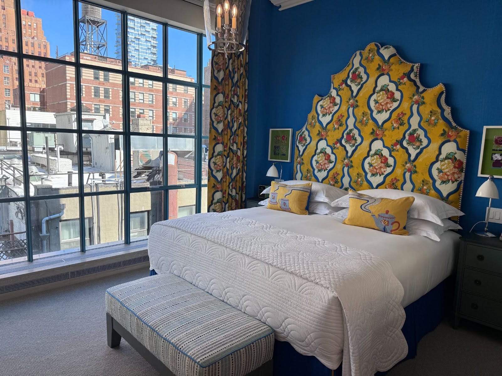 The rooms: That aesthetic continues in the 69 rooms spread across 11 floors, with wildly patterned headboards crowning most beds. One notable touch: top floor rooms are designed for stays of 30-plus days, featuring first-NYC-apartment-sized kitchenettes (albeit with tonier finishes). For a mid-March weekend night, a standard king runs $925/night.