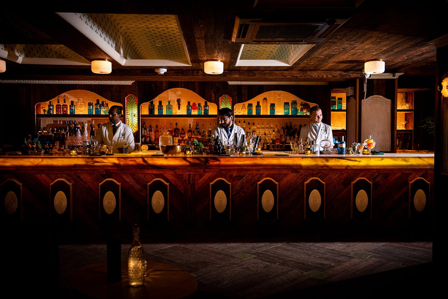 Apotheke (above), dramatic interiors for ‘prescription-style’ cocktail menu, drinks labeled by ‘remedy, and live entertainment seven nights a week