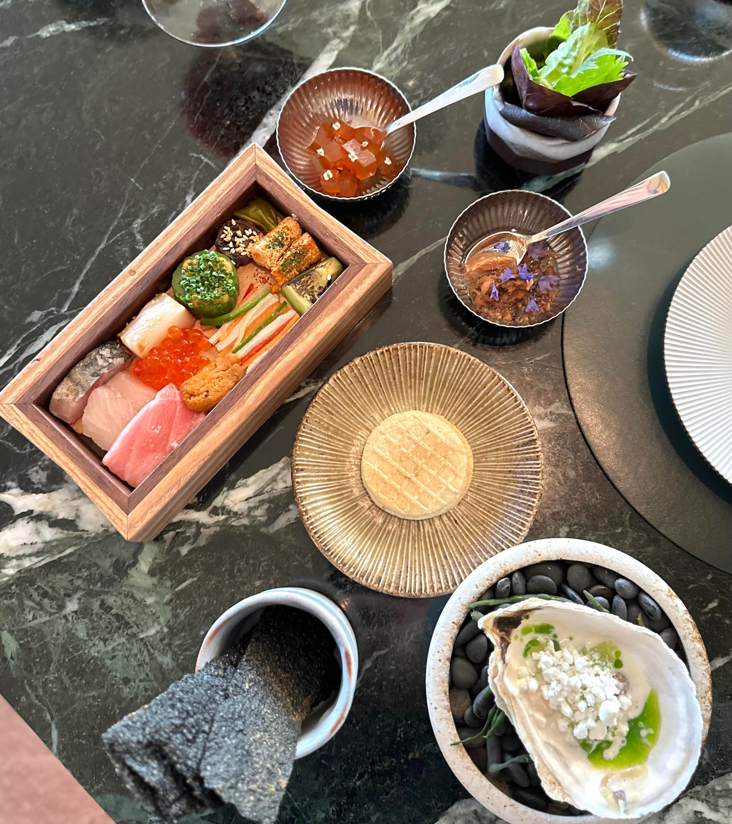 At Saga, 63 floors above Wall Street, the new menu begins with a “Kento Box” (above), named for chef James Kent — a DIY canapé set featuring toro, uni, mackerel and more. Next, a celebration of sungold tomatoes, followed by the dry-aged duck tagine, still among the best fowl in the city.