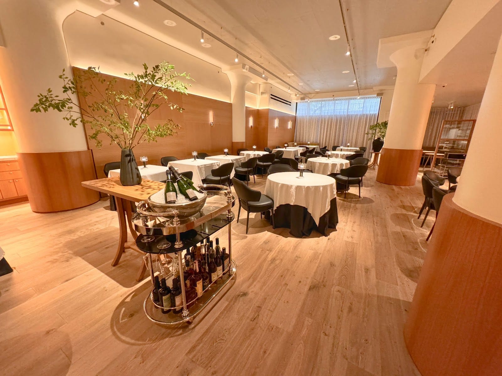 The Vibe: Situated in a former printing press building, the space previously housed a deli, not that you’d know it now. A spacious open kitchen — anchored by a custom matte black and stainless steel Bonnet range surrounded by a U-shaped, 13-seat white oak dining counter — claims about half the interior. The dining room is outfitted in shades of cream and black. Roomy, round tables sit directly behind the kitchen, placed so there’s not a bad seat. A stocked custom Champagne cart sits in the center of the room, a fitting showpiece (or signpost).