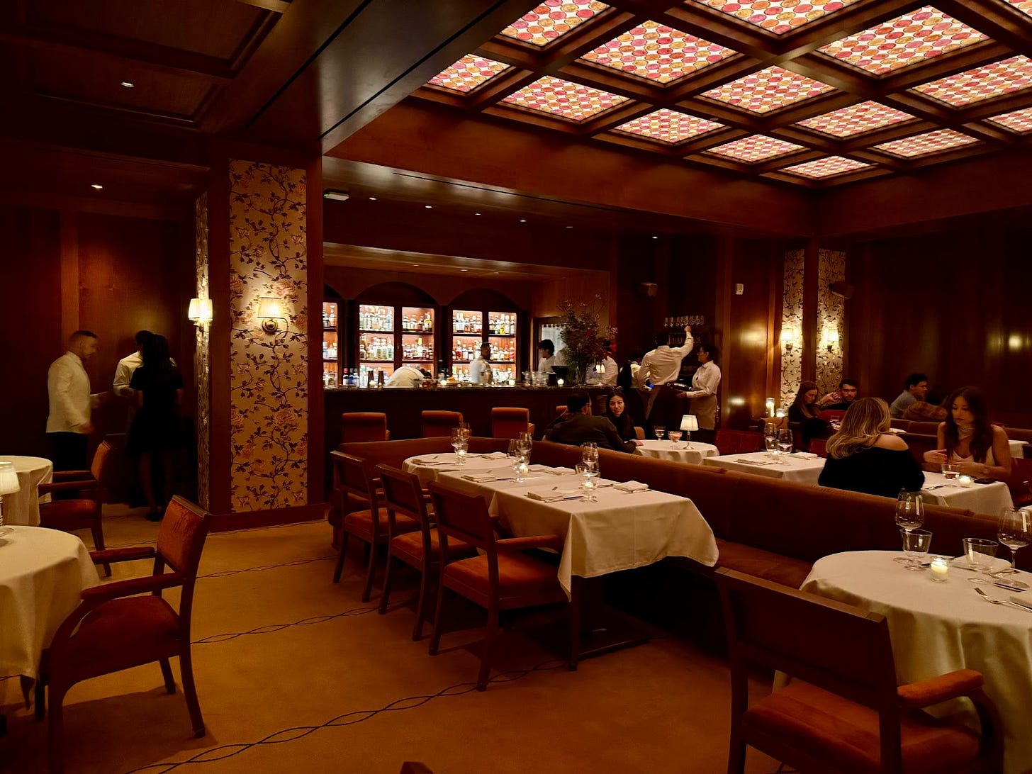 The vast space is a network of three large, interlocked rooms that run from the street entrance through a bar room for drop-ins, cocktails, and more casual bites, to the middle atrium that will serve as an all-day cafe once breakfast and lunch open (though already seating dinner guests), through to the back dining room. Not unlike La Tete D’Or, this dining room stretches on for an unexpectedly long distance before resolving at its far end in booths and another bar. The ceiling above glows through stained-glass panels.