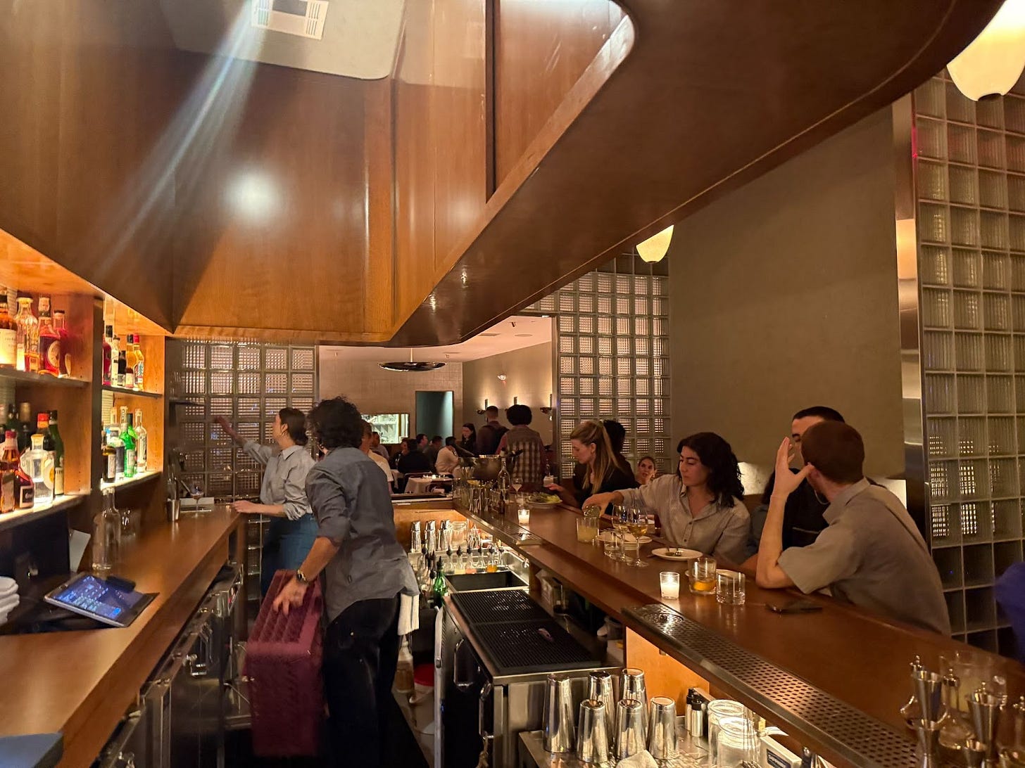 Running early, I took a seat at the end of the curved wood bar by the windows and surveyed the scene. Frosted glass cubes right out of a 1970s rec room divide the front area — which includes that bar and two bar tables — from the back dining room. I couldn’t help but notice every other arriving guest either embrace the maitre’d or say hello to the bartenders. Given the hospitality industry pedigree of the team here, it makes sense: Chef Sam Lawrence was previously the culinary director of Ignacio Mattos’s local restaurant empire (Lodi, Altro Paradiso, and pioneering restaurant Estela).